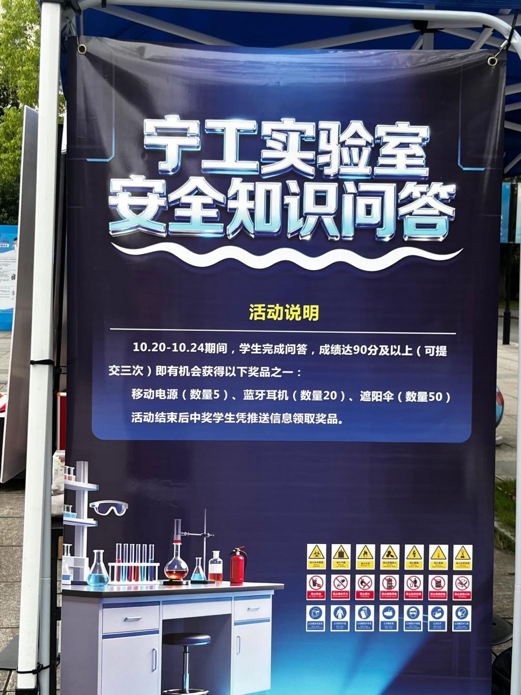 安全主题宣传日当天,竹园餐厅南门广场上20块实验室安全宣传展架整齐排列,成为师生驻足学习的“安全课堂”。展架内容紧扣实验室安全核心需求,按 “安全知识、应急处置、案例警示” 三大板块分类摆放:“安全知识” 清晰列出实验室水电、消防、危化品、实验设备安全的规范要求及安全防护用品的选取原则;“应急处置” 详解火灾扑救、触电急救、人员中毒急救、化学品泄漏处置等标准流程;“案例警示”选取近年高校典型事故案例,剖析违规操作的惨痛后果。